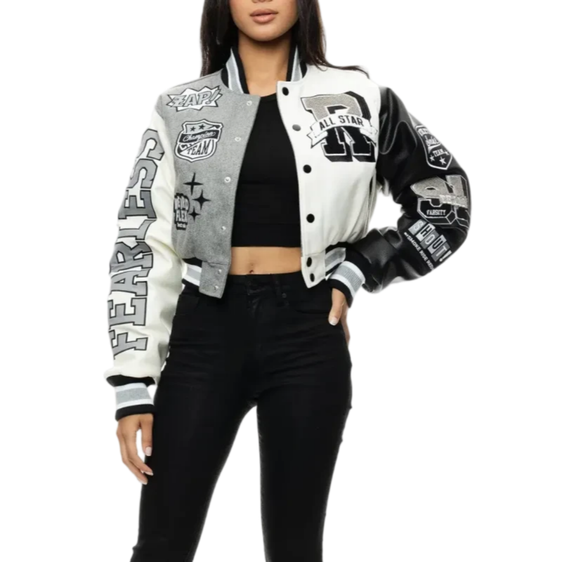 This letterman varsity jacket combines traditional elements like snap button closures, striped ribbing, and embroidered detailing with an urban streetwear attitude. It’s a jacket that tells a story—of school pride, athletic legacy, and modern confidence. The design is nostalgic but not dated, making it perfect for women who love varsity culture but want a fresh, updated spin on it. This is where varsity meets versatility.