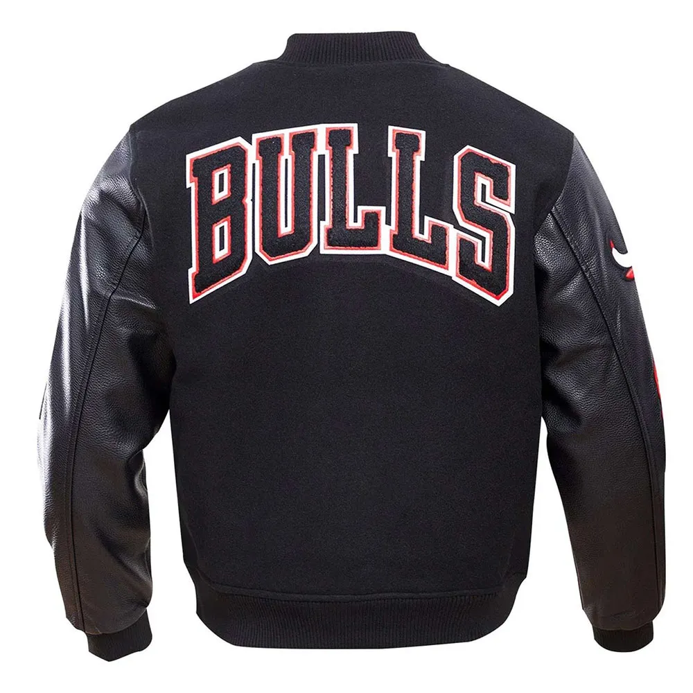 The jacket proudly features officially inspired Chicago Bulls detailing, including the vintage team logo embroidered on the chest and classic team color accents that nod to the franchise’s bold style. The black base provides a strong canvas for the red and white Bulls motifs to pop, making it a striking choice for game day or casual wear.