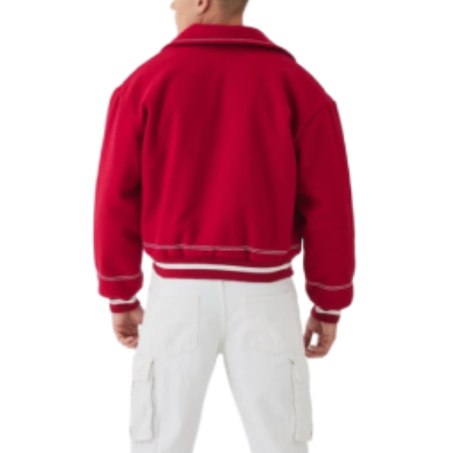 This red wool jacket is crafted from a high-quality wool blend that delivers both warmth and structure. It’s not too heavy, not too light—ideal for layering across multiple seasons. Unlike standard bombers, the wool texture gives it a rich, elevated feel that stands out. Ribbed cuffs, hem, and collar give a snug varsity fit, while the interior lining ensures comfort and breathability throughout the day. This is outerwear that works as hard as it looks good.