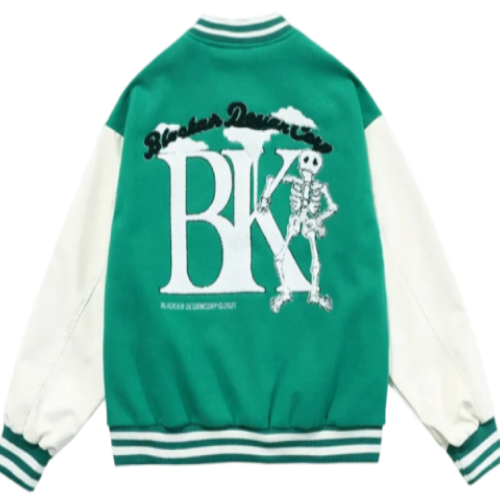 The signature feature? A fierce skull embroidery or patch across the chest or back (depending on placement), offering standout style that sets this jacket apart from your average varsity. Paired with the deep green base and contrast sleeves, the look is commanding without being loud. The color and detailing strike a balance between bold and wearable—easy to pair with jeans, cargos, or joggers. The green letterman jacket look works with sneakers, boots, or layered with hoodies for a rugged, urban finish.