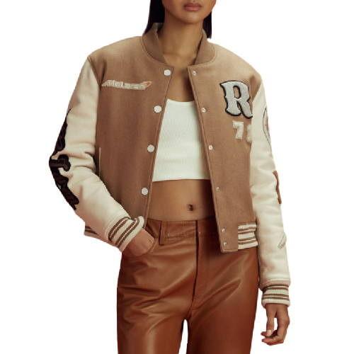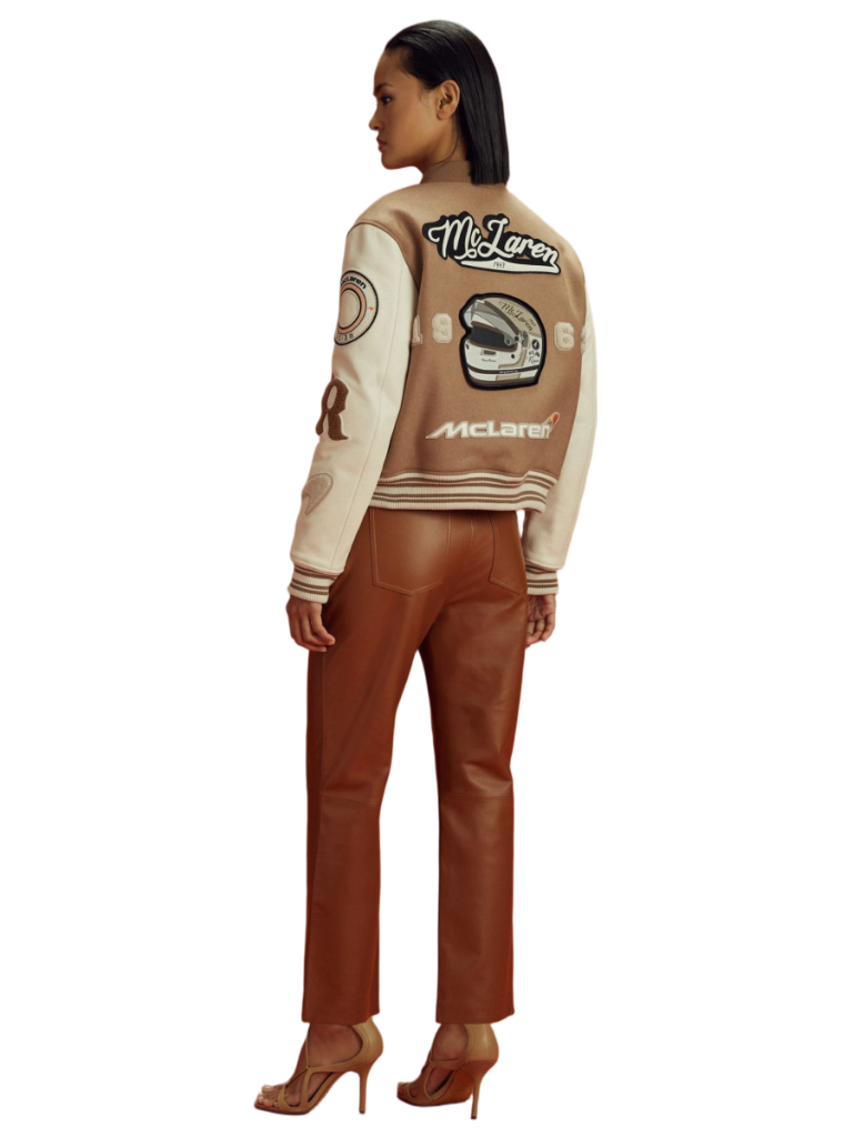 Drawing influence from Maclaren’s racing heritage, this F1 jacket features race-inspired motifs and minimal but impactful branding. Classic varsity elements—such as the letterman-style body, stripe detailing, and structured form—remain intact, offering authenticity with a modern twist. It’s a blend of streetwear, fan gear, and fashion-forward outerwear that feels rooted in performance but made for the city.