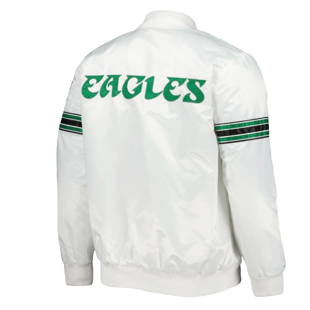 Crafted with a sleek white satin finish, this Philadelphia Eagles satin jacket brings that classic ’80s starter jacket vibe back — think retro cool meets modern comfort. It’s the kind of vintage Eagles starter jacket fans have been searching for, now updated with better fit, soft inner lining, and durable details.