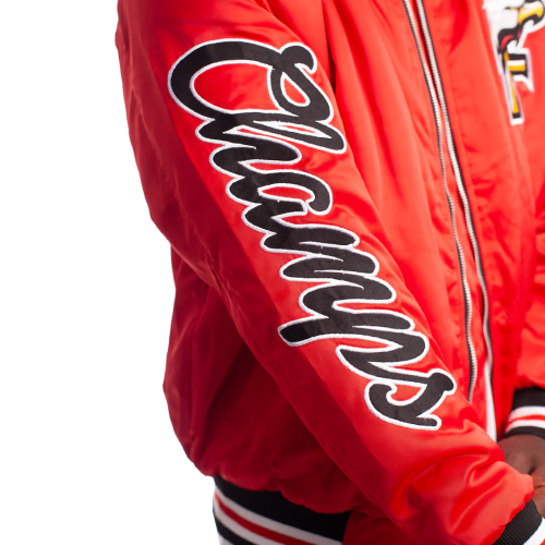 Crafted from high-shine satin, the red varsity jacket brings together bold color and sleek texture in one striking package. The rich red body gives off just the right amount of shine without looking flashy. It feels smooth to the touch and remains breathable, making it suitable for year-round wear. The black rib-knit collar, cuffs, and hem contrast perfectly with the red base, keeping the overall look grounded. Whether buttoned up or left open, this satin varsity jacket makes sure you stand out without overdoing it. The snap-button front is traditional and reliable, while the soft inner lining keeps it comfortable on the inside.